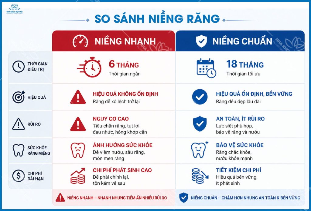 Niềng nhanh rút ngắn thời gian nhưng có thể không kiểm soát đầy đủ khớp cắn, trong khi niềng chuẩn đảm bảo ổn định lâu dài.