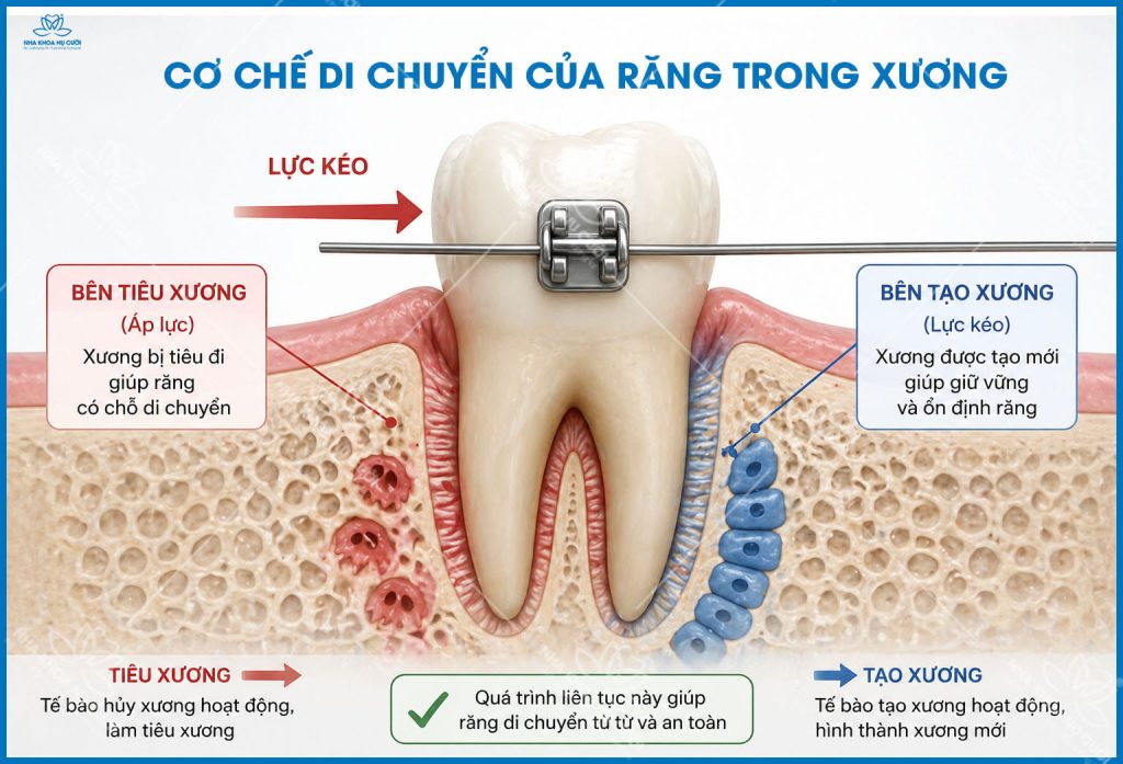 Răng di chuyển dựa trên quá trình sinh học của xương, cần thời gian để tiêu và tái tạo, không thể đẩy nhanh tùy ý.